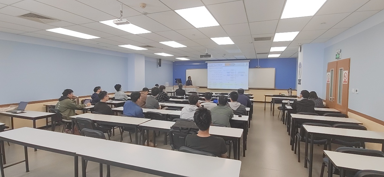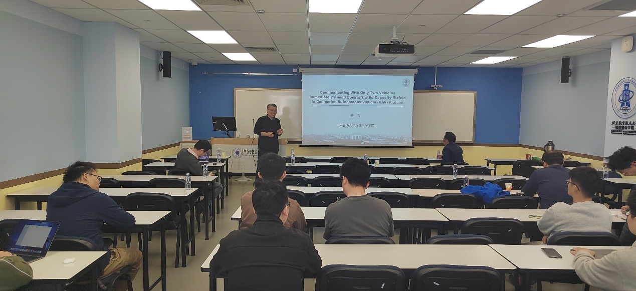 由于田野实验受限于CAV数量规模,团队进一步开展了大规模数值仿真,基于田野实验获取的关键参数(如CAV通信方式、加速度、跟车距离等)构建了精细化仿真模型。研究结果表明,在特定条件下,采用两车通信模式的CAV编队策略相较于传统人工驾驶,可使交通系统运行效率提升近六倍。这一突破性发现为CAV编队技术的实际应用提供了重要理论支撑。报告结束后,与会师生围绕实验设计、仿真优化及工程化落地等问题与姜教授展开了热烈讨论,现场学术氛围浓厚,报告会取得圆满成功。