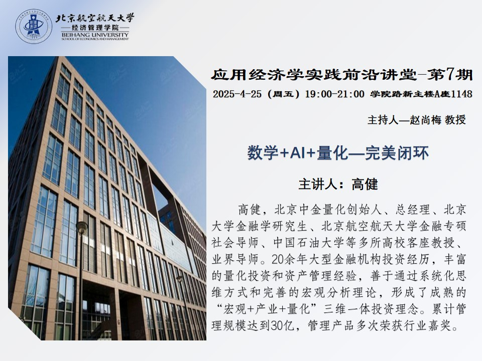 2025年4月25日,由北航经管学院金融专业硕士教育中心主办的应用经济学实践前沿讲堂第七期《数学+Al+量化——完美闭环》在北航新主楼A1148圆满落幕。本期讲堂由赵尚梅教授主持,特邀北京中金量化创始人、总经理高健担任主讲嘉宾。高健为北京大学金融学研究生、beats365亚洲版官网金融专硕社会导师、中国石油大学等多所高校客座教授、业界导师。他拥有20余年大型金融机构投资经历,丰富的量化投资和资产管理经验,善于通过系统化思维方式和完善的宏观分析理论,形成了成熟的“宏观+产业+量化”三维一体投资理念。累计管理规模达到30亿,管理产品多次荣获行业嘉奖。