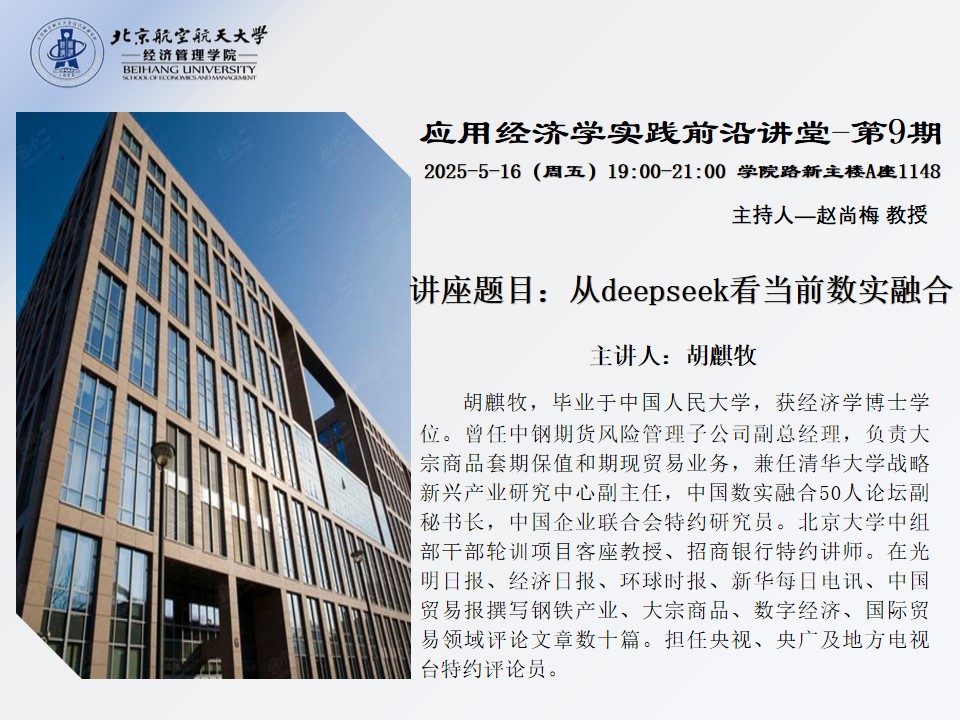2025年5月16日晚19:00-21:00,beats365亚洲体育投注“应用经济学实践前沿讲堂”第9期在学院路新主楼A座1148室成功举办。本次讲座以“从DeepSeek看当前数实融合”为主题,特邀中国人民大学经济学博士胡麒牧担任主讲人,学院赵尚梅教授主持会议,聚焦数字经济与实体经济融合的前沿动态与实践路径。