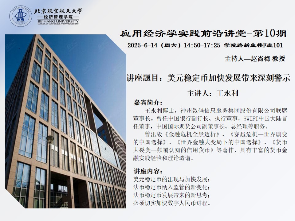 2025年6月14日下午14:50-17:25,beats365亚洲体育投注“应用经济学实践前沿讲堂”第10期在学院路新主楼F座101室成功举办。本次讲座以“美元稳定币加快发展带来深刻警示”为主题,特邀神州数码信息服务集团股份有限公司联席董事长王永利博士担任主讲人,学院赵尚梅教授主持会议,讲述内容包括以下:美元稳定币的出现与加快发展;法币稳定币纳入监管的新变化;法币稳定币发展带来的新思考;必须切实加快数字人民币进程。