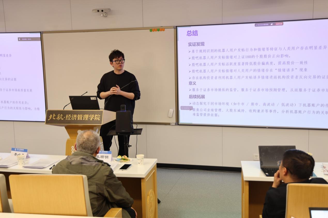 第二篇论文《Too Good to Be True: Misinformation and Ambiguity Aversion》由北航经管学院王论意博士汇报,杨立岩教授、李心丹教授担任点评人。论文作者之一张顺明教授参与现场讨论交流,就研究相关问题深入探讨。