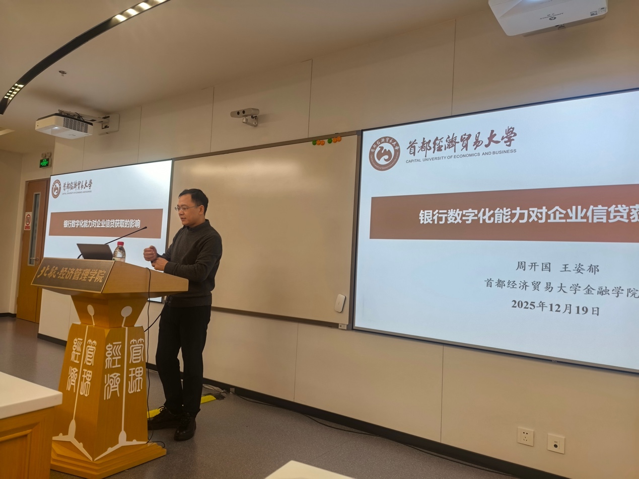 由beats365亚洲体育投注金融系主办的“融实论坛”2025年第11期(总第78期)于2025年12月19日(周一)10:00-11:30,在北航学院路校区新主楼A618顺利举行。本期论坛邀请首都经济贸易大学金融学院周开国教授,做题为“银行数字化能力对企业信贷获取的影响”的学术报告。