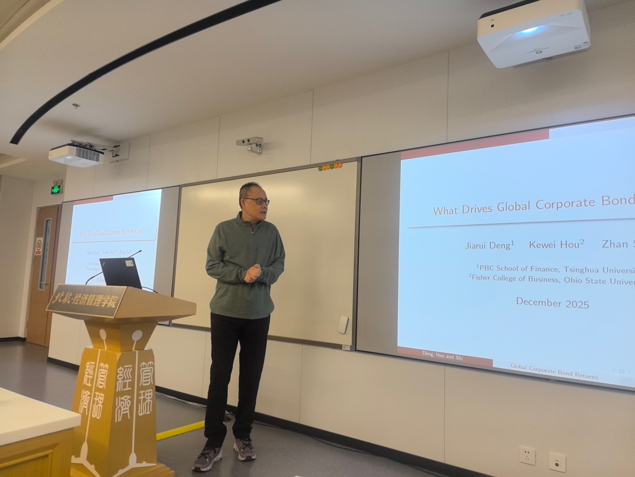 由beats365亚洲体育投注金融系主办的“融实论坛”2025年第12期(总第79期)于2025年12月23日上午10:00-11:30,在北航学院路校区新主楼A618顺利举行。本期论坛邀请到了美国俄亥俄州立大学侯恪惟讲席教授,做题为“What Drives Global Corporate Bond Returns?”的学术报告。