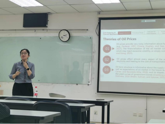 张教授在报告中分享了她最新的一项研究工作“Crude Awakening: Oil prices and Bond Returns”。油价中蕴含着丰富的信息,但因为噪音太大,油价变化无法直接预测资产的回报。同时,油价的变化会影响人们对通胀的预期,导致央行对此作出反应,进而影响国债收益率。基于这些观点,张教授团队选取了来自15个发达国家和5个新兴国家共20只国债并计算它们的债券收益率和超额收益率。在油价的选取上,考虑了从Bloomberg数据库获取的WTI原油和布伦特原油这两个油价序列,原油趋势价格定义为每日价格的30个月移动平均的月度变化,并使用偏最小二乘方法将原油趋势价格序列与1至12个月到期的现货价格和期货价格相结合,从而消除大量与未来债券风险溢价无关的噪音。研究发现,对于发达国家和新兴国家,样本内和样本外的回归结果都表明油价上涨与随后更高的债券回报相关,且基于原油趋势价格因子的预测改进了基于当前期限结构预测因子和宏观经济预测因子的预测。同时,研究还证明原油趋势价格主要受需求冲击而非供应冲击驱动,因此原油趋势增长往往预示着经济疲软和更高的债券回报率。张教授的研究具有重要的理论意义及实践价值。