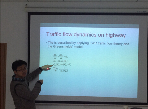 王教授以新加坡人口增长为背景,研究在线性连续的交通走廊中的最优城市人口密度分布,并以此达到最优的交通系统规划。他详细介绍了模型的构建思路,讲述了通过二阶偏微分方程系统对上下班交通格局的时空动态模拟,最后用数值算例进行了模型的有效性检验。在座师生同王教授就模型构建、数值检验等诸多问题进行了积极讨论。