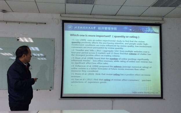 11月21日晚,我院信息系统系教授姚忠老师为研究生做题为《Consumer-Generated Reviews and Social Learning:Implications for Quality Perception of New Products》的讲座。出席本次讲座的有我院的硕士研究生和博士研究生。讲座主要介绍了姚忠教授的最新研究成果,即消费者评论和社会学习对新产品质量感知的影响以及用户购买行为的影响。