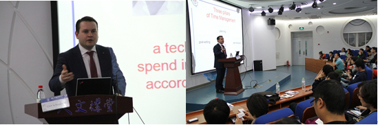 Gleb Arhangelsky博士还向我们介绍了一些时间管理的小技巧,比如记录下一些关键事件从而不断的自我提醒、经常进行自我激励和自我奖励,从而使自己保持热情。在讲座的最后,同学们踊跃地向Gleb Arhangelsky博士咨询有关时间管理上的困惑,Gleb Arhangelsky博士也结合自身经历,精彩地解答了同学们的疑问,并向5名提问同学赠予授书。
