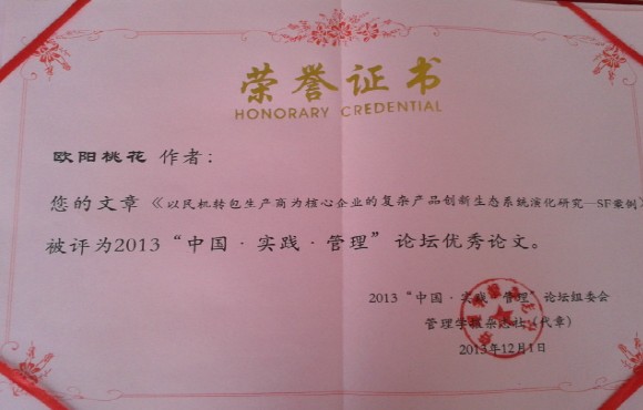 2013年11月30日-12月1日,由南开大学商学院与《管理学报》杂志联合主办的2013“中国·实践·管理”论坛在南开大学举行。我院欧阳桃花教授、谭振亚教授、周宁教授、博士生胡京波和曾德麟五人共同撰写研究案例论文《以民机转包商为核心企业的创新生态系统演化研究——SF案例》荣获了2013“中国·实践·管理”论坛的优秀论文奖。胡京波博士生代表研究团队专程赴南开大学商学院分论坛宣读论文。本届“中国·实践·管理”论坛的投稿论文104篇,其中论文宣读34篇,优秀论文奖6篇。