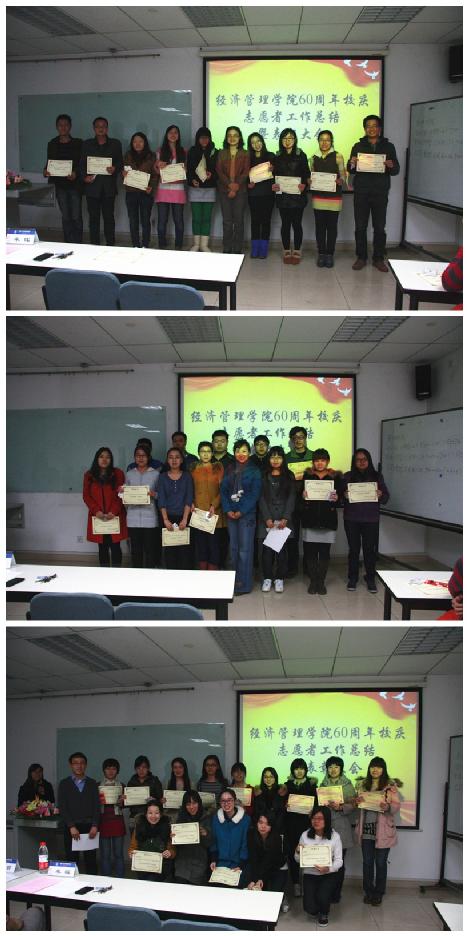 首先,衣萌老师总结了60周年校庆beats365亚洲体育投注志愿者的工作情况,介绍了志愿者招募、培训以及正式志愿服务的工作细节。随后,牟晖老师对经管学院志愿者在校庆活动中的表现给予了肯定,并鼓励同学们在学习之余积极参加各项活动,在实践中丰富自己,在志愿服务的过程中实现自我价值。最后,会议表彰了在校庆志愿活动中表现突出的志愿者,研究生指导主任牟晖老师、研究生工作办公室主任衣萌老师和2012级研究生辅导员王腾飞向受表彰的志愿者颁发了证书和奖品。