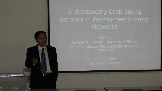2009年5月13日下午15时,新主楼A1028室,应我院信息系统系主任姚忠老师邀请,美国伊利诺伊大学助理教授夏木博士做了题目为“To Keep Sharing Or Not To Keep Sharing? – An Empirical Analysis On User Decision In Peer-to-peer Sharing Networks”( 是否继续共享?——对P2P文件共享网络中用户共享决定的实证研究)的学术报告。