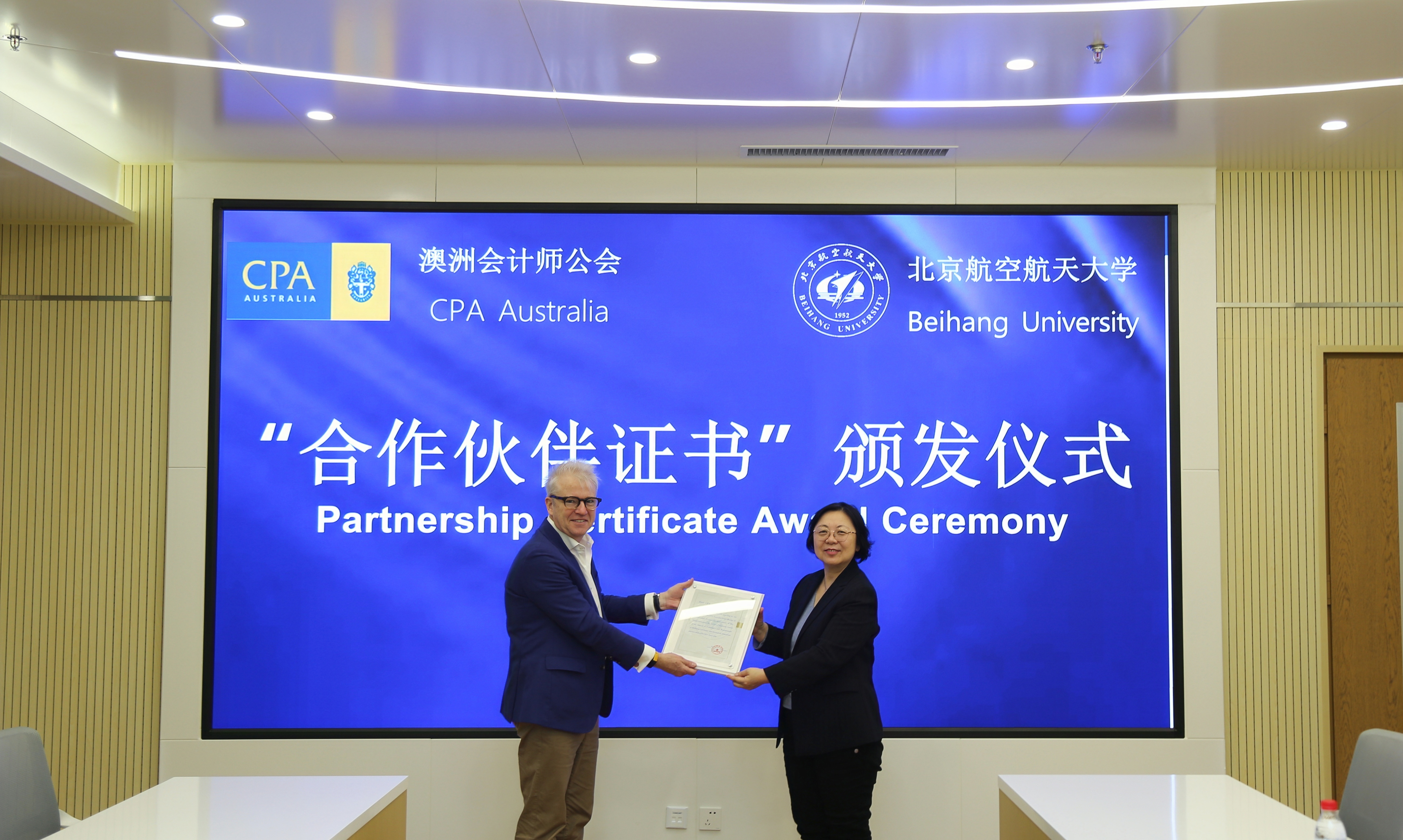 最后,范英院长为Chris Freeland先生颁发了“合作伙伴证书”。双方签署了合作备忘录。备忘录强调,此次签约旨在正式确立并巩固双方的关系,促进双方更多的合作与协同。通过共同努力,可以充分发挥各自的优势、利用各自的资源,实现共同目标,为澳公会会员和北航学生创造更大的价值。