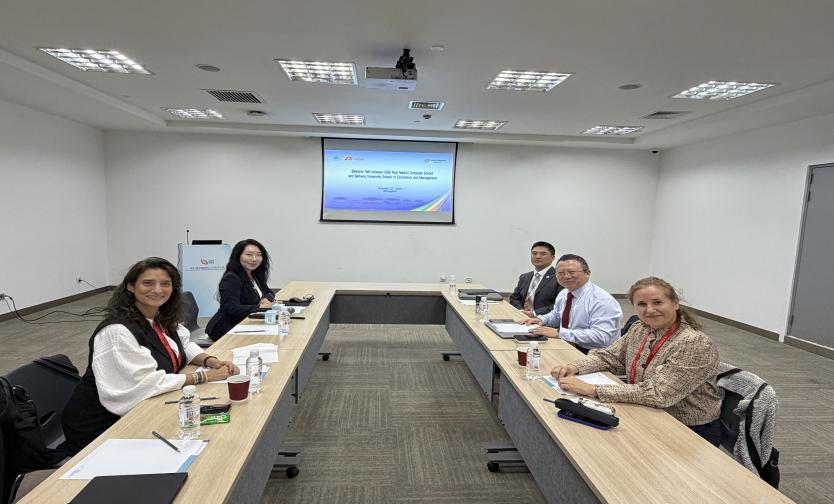 院长范英教授、管理科学与工程系孙晓蕾教授、学院外事助理郝壮副教授与里约热内卢联邦大学理工学院总监Thiago Gomes de Lima教授举行会谈