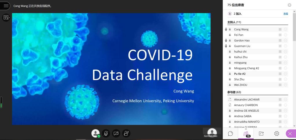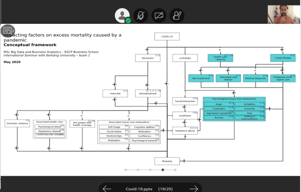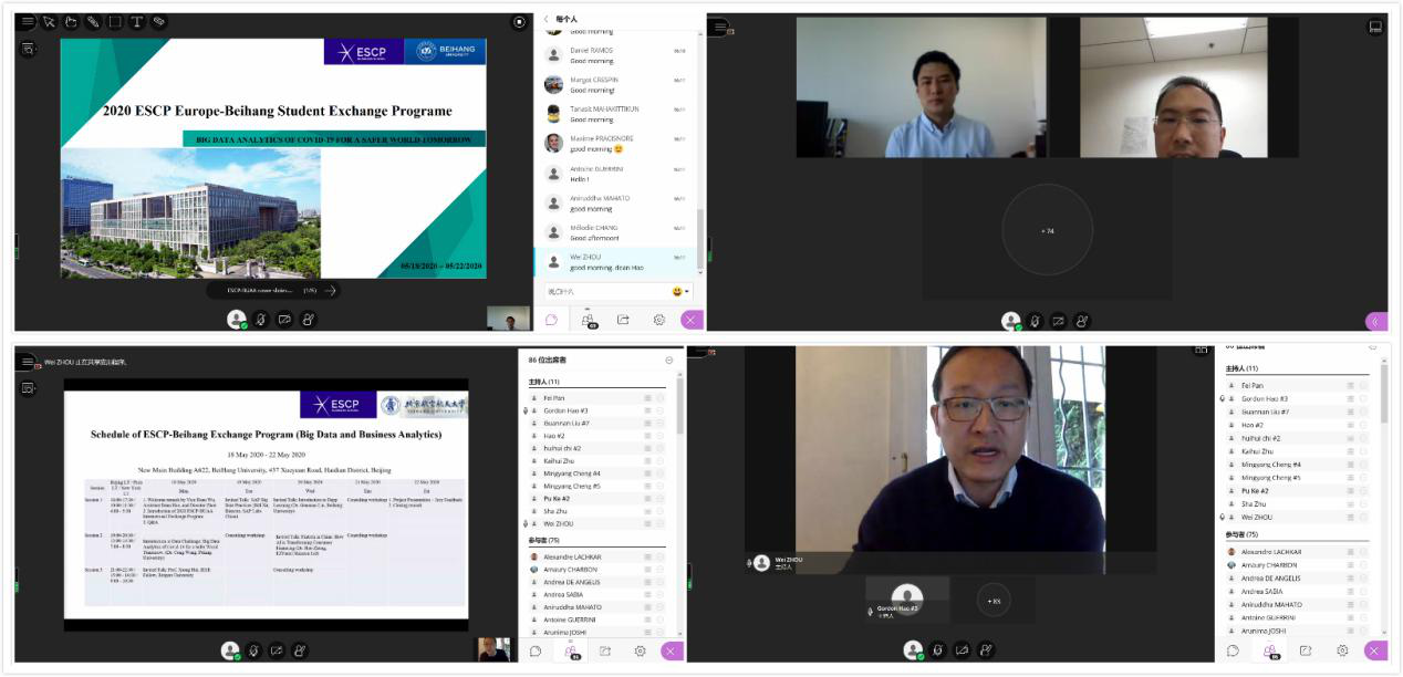 在新冠病毒全球肆虐、beats365唯一官方网站几乎中断的形势下,beats365亚洲体育投注积极贯彻北航党委“坚持以人民为中心,发挥科研优势,坚决打赢疫情防控阻击战”的精神,联合ESCP欧洲商学院,不断开拓创新、充分协调各方资源,以“探索新冠肺炎大数据 共创美好世界新未来(Bigdata analytics of COVID-19 for a safer world tomorrow)”为主题,精心设计了此次线上beats365唯一官方网站活动。北航beats365亚洲体育投注副院长吴俊杰教授和院长助理郝金星教授、ESCP欧洲商学院项目主任周炜教授和Louis-David Benyayer教授对该项目进行了统筹安排,刘冠男讲师、外事秘书朱凯慧等进行了精心组织,实验中心孟岩,程阳明进行了会议技术保障。