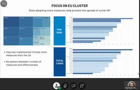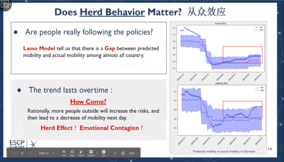 此次线上beats365唯一官方网站活动还进行了“新冠肺炎大数据”数据挑战赛,5天、13个小组、80名ESCP商学院国际学生积极参与并进行了线上答辩。学生通过综合应用课堂中学习到的机器学习、时间序列、计量经济、优化建模等方法,系统开展了Covid-19大数据的挖掘与分析,取得了丰硕的阶段性成果。这些成果大致分为三个方面。围绕疫情影响,研究了疫情对全球经济、比特币交易、失业率、社会不平等现象等的作用机理;围绕政府抗击疫情的措施,探究了居民对于政府措施的服从程度、措施实行的范围时长、不同国情导致措施的差异化等对于对病毒传播率、死亡率的影响;围绕疫情中的社会现象,指出社会中存在抗疫资源分配不平等、民众从众心理下的出行差异以及抢购、解禁后女性感染率上升等现象。此次在线数据挑战赛,也体现了不同文化背景下的思想交流碰撞。同学们纷纷表示此次线上挑战赛不仅开拓了自身学术视野、检查了自身学习效果,而且体验了自身研究成果所带来的丰收与喜悦。