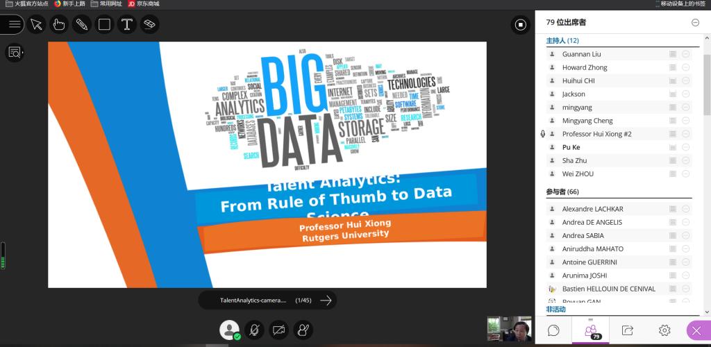 此次线上beats365唯一官方网站活动名师荟萃,跨越三个不同时区、来自三所世界著名高校和两所著名企业的专家学者开展了五场精彩学术报告。IEEE会士、美国罗格斯大学熊辉教授旁征博引以“人才大数据分析”为题进行了主旨发言,SAP中国研究院总监徐磊高屋建瓴宣讲了系列新时代企业智能化转型案例。