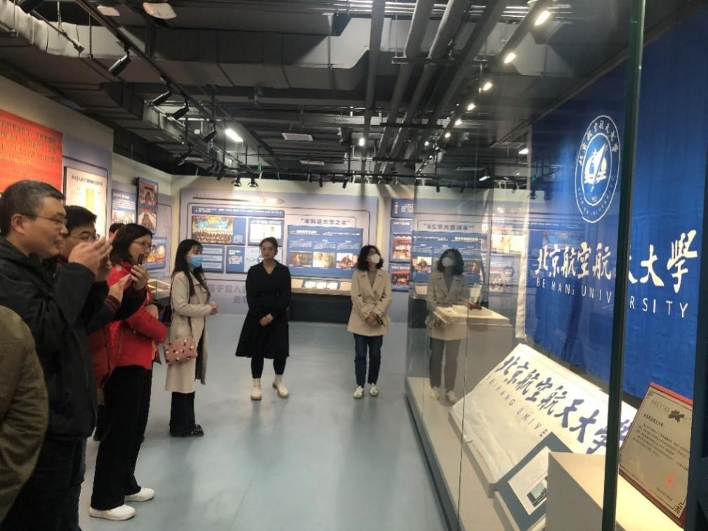 党课后,党支部组织系内教师参观北航校史馆,在“北航梦”的历史进程中进一步感悟党的精神力量,更好地传承与发扬北航的创新发展精神。走进新建的校史馆大厅,映入眼帘的是“空天报国”主题浮雕,初代北航人的精神风貌在雕塑中展现得淋漓尽致。