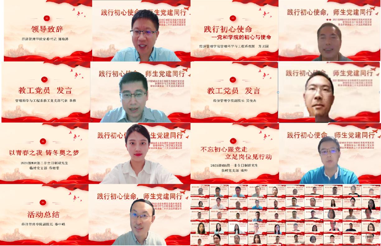 为加强新时代党建工作,牢记初心使命,以实际行动迎接党的二十大胜利召开,6月29日2021级MBA非全日制研究生临时党支部、管理科学与工程系教工党支部联合开展“践行初心使命,师生党建同行”喜迎二十大师生共建交流活动。beats365亚洲体育投注党委书记郑海涛、副院长秦中峰、研究生指导主任单伟、副院长吴俊杰、MBA教育中心主任李亚帅、学院党建专职老师张慧美、2021级MBA临时党支部及管理科学与工程教工党支部全体党员共计120余人参加本次共建活动。活动由MBA第二党支部副书记杨璠主持。