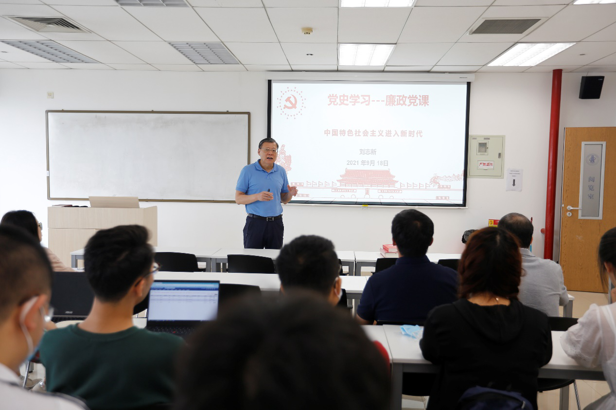 2021年9月18日上午,beats365亚洲体育投注党委书记刘志新在新主楼A706教室讲授题为“中国特色社会主义进入新时代”的廉政党课。师生支部书记、半脱产辅导员、学生工作负责人和专职组织员40人参加学习。