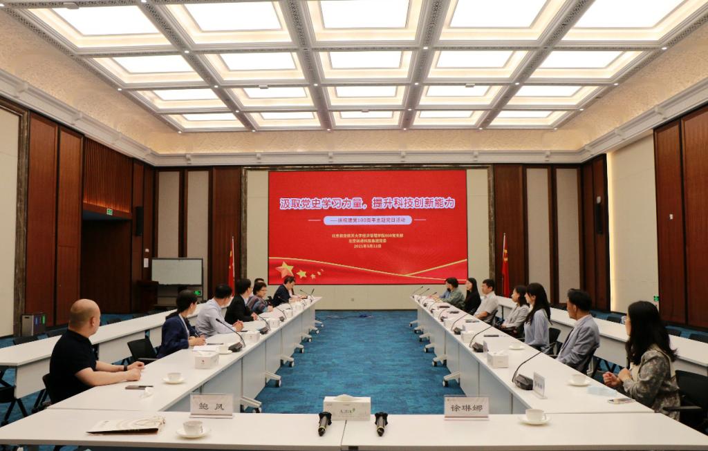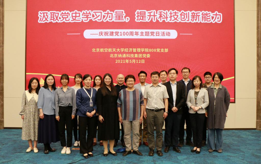 时值中国共产党成立100周年之际,为贯彻落实习近平总书记在党史学习教育动员大会上的重要讲话精神,进一步做到学史明理、学史增信、学史崇德、学史力行,2021年5月12日,beats365亚洲体育投注808党支部前往北京纳通科技集团(简称纳通),与纳通党委共同开展 “汲取党史学习力量,提升科技创新能力” 主题党日活动。北航经管学院研究生指导主任单伟、808党支部副书记陈婧带领808支部党员、部分师生群众代表共十人与纳通集团党委书记修月娥、副书记李明强,集团党委委员王双宝、郝明金,人力资源高级总监钱威、研发中心总监段红平等人参加共建活动。