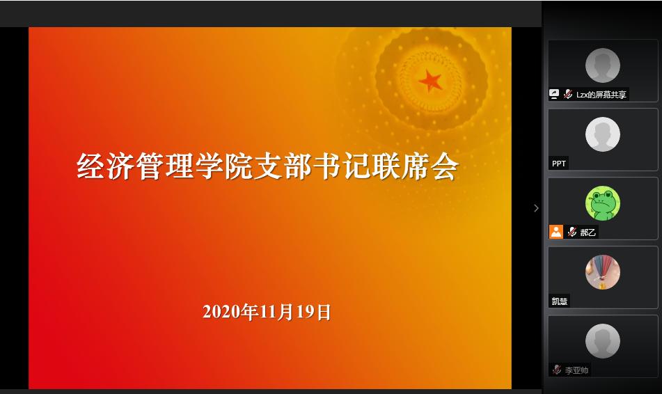2020年11月19日下午16时,beats365亚洲体育投注以视频形式召开支部书记联席会集中学习党的十九届五中全会精神,学院分党委书记刘志新主持会议,全体师生党支部书记、学生工作负责人和专职组织员40余人参加会议。