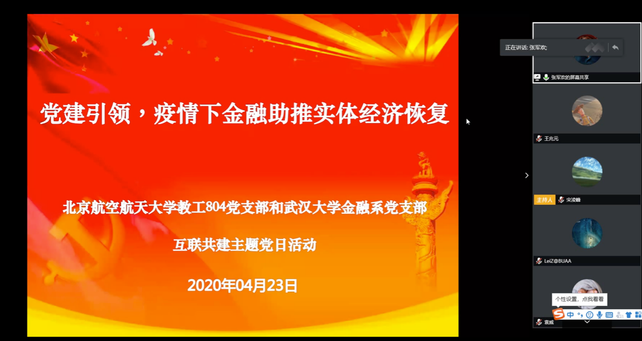 2020年4月23日下午,beats365亚洲体育投注教工804党支部联合武汉大学经济与管理学院金融系党支部在线召开“党建引领,疫情下金融助推实体经济恢复”的互联共建主题党日活动。