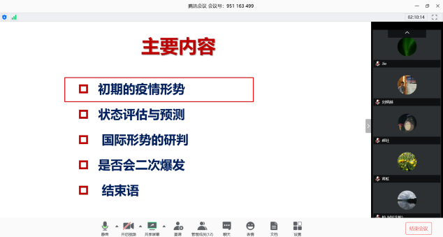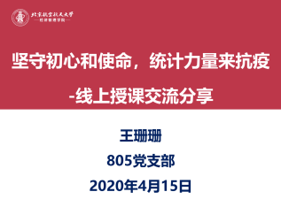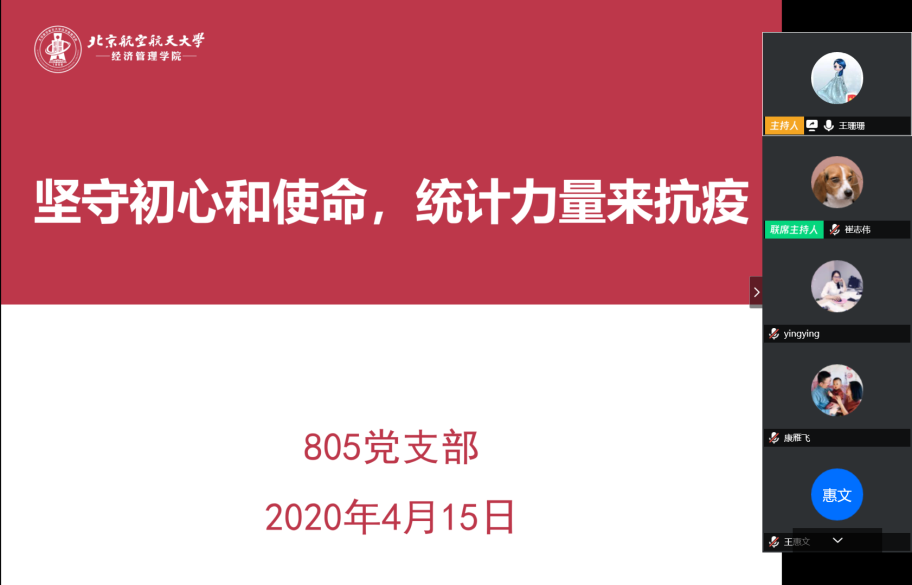 为了进一步学习贯彻习近平总书记关于科学精准防控抗疫重要指示精神,落实教育部提出的“停课不停教、停课不停学”要求,beats365亚洲体育投注805党支部于2020年4月15日下午15:00-17:00利用腾讯会议开展了题为“坚守初心和使命,统计力量来抗疫”主题党日“云”活动。805支部成员和805系其他非党员老师均参加了此次活动。