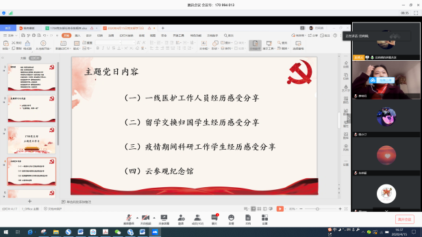 本次主题党日邀请了学院本科生廖珅的母亲分享其作为湖北医护人员在疫情期间的经历和感受。曾护士长分享了她作为眼科护士长在疫情期间所承担的主要工作,所面临的一些困难,接着讲述了党和政府对湖北地区提供的及时的支援和救助,之后生动具体地向我们描述了她在疫情期间具体的工作内容以及一些感人经历,以小见大地反映了所有的医护人员在整个疫情期间所付出的巨大努力,在抗击疫情时的万众一心。2016级本科生赵建霞和冯博佳分享作为留学交换归国学生的经历。两位本科生对自己在比利时的经历和整个回国的过程做了分享,并讲述了在整个归国的过程中,所切身体会到的国内对疫情防控相关工作的完备,以及国家所带来的安全感,表达了对祖国的热爱和自豪。学院2017级本科生吴祁颖同学分享了他参与疫情研究相关工作的经历。在疫情防控期间,吴祁颖参与王惠文教授的科研团队工作,利用数据分析监控全国地区的疫情发展情况,撰写提案,通过民建等组织提交,其中《关于考虑分期、分批恢复全国各地社会经济活动的建议》被民建中央采用,展现了当代大学生的心系祖国、心系人民的责任与担当。