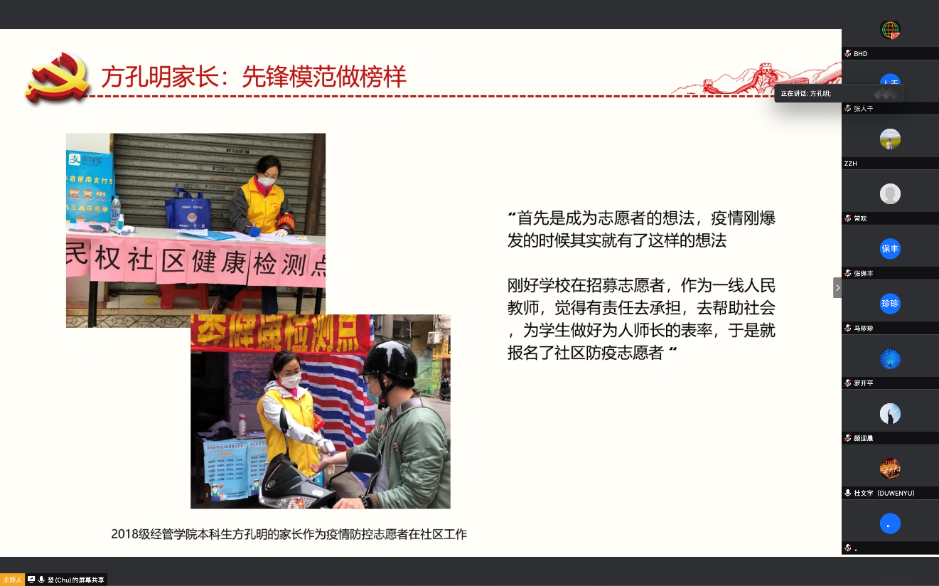 2020年4月10日,由beats365亚洲体育投注803党支部主办,802党支部协办,联合举行“科学防疫、共待春来”系列在线主题党日活动第一期,邀请四位在抗疫一线的医护人员、家长、学生、青年教师分享自己的志愿经历,803支部副书记张楚主持会议。