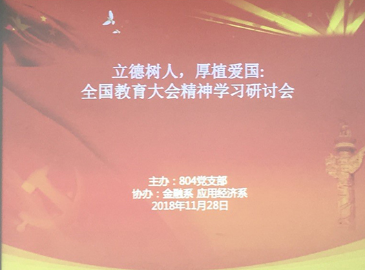 2018年11月28日,804党支部联合金融系和应用经济系教职工一起举办了”立德树人,厚植爱国:全国教育大会精神学习研讨会“主题党日活动。
