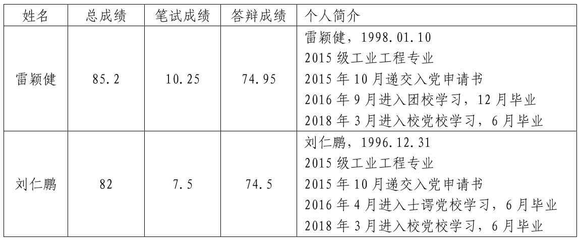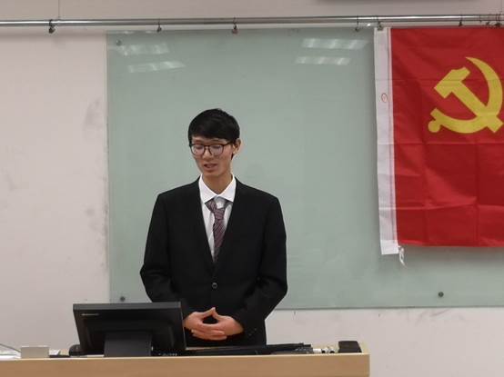 第一位答辩者是雷颖健同志。首先,他从父母的引导与鼓励以及自我要求讲起,述说自己对党的认识与理解,表达了他对党由浅入深的认识,以及在思想的成熟与发展中逐渐树立对党正确客观的认识。他将自己的入党动机来源概括为家人的鼓励、亲人党员的言传身教、想成为对社会国家有用的人,以及内心爱国爱民的情怀。在答辩过程中,雷颖健同志还分别介绍了他的学习状况,学生工作经历以及所获荣誉。在谈到自身的不足与改进时,雷颖健同志鞭策自己未来能够更沉稳细心地工作。雷颖健同志选读的文献是马克思《青年在选择职业时的考虑》,令其感受深刻的是面对现实条件与理想追求的冲突,如何在冲突中克服困难、坚定理想信念。他表达了自己对于这篇文章的理解,并强调了理想信念的作用。
