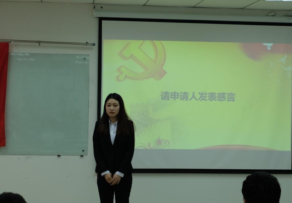 大会开始,支部书记丁得彬报告了大会出席情况,确认会议有效并宣布大会议题。随后,全体同志起立,唱国际歌。紧接着,拟发展对象徐璐宣读入党志愿书,讲述她对中国共产党这一组织的认识并表达了自己渴望早日通过组织考察、加入中国共产党的愿望,同时徐璐同志也深入剖析了自己在主观能动性等方面的不足,比如学习需要更加努力、党的理论知识需要进一步加强等,最后她表示今后会不断改进加强,积极向组织靠拢。