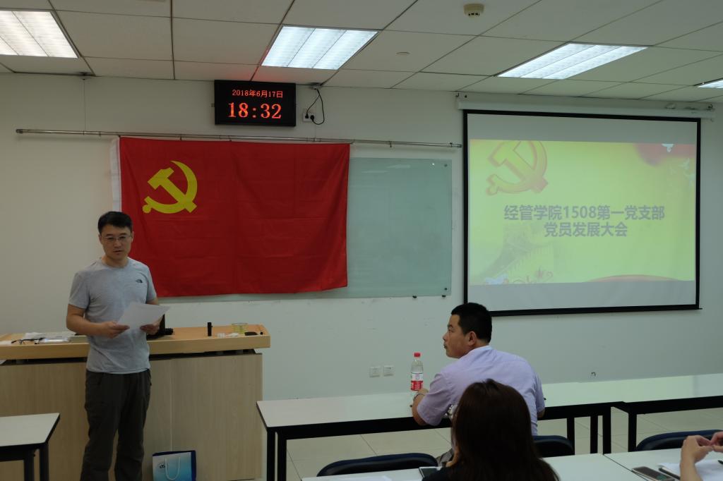 2018年6月17日晚6点半,1508第一党支部在新主楼A949成功召开党员发展大会,讨论是否接收徐璐同志为预备党员的问题。会议由支部书记丁得彬主持,学院副院长张人千教授、学院专职辅导员朱鹏宇老师以及支部全体党员参加了此次会议。