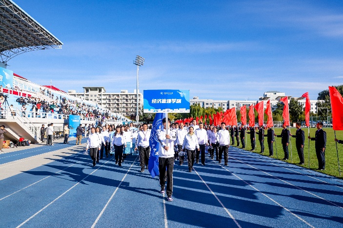 上午8时许,伴随着《运动员进行曲》激昂的旋律,学院书记郑海涛、工会主席牟晖等领导带领由70余位师生共同组成的经管学院代表团,迈着整齐有力的步伐,走向主席台。代表团精神饱满,口号响亮:“激情澎湃,勇攀新高,且看经管,搏浪弄潮!”这一声声充满自信与力量的呐喊,不仅展现了经管学院师生朝气蓬勃、积极向上的精神面貌,更体现出学院在党委的坚强领导下,凝聚起全体成员的共同信念。以管理科学与工程为核心,应用经济学和工商管理学为两翼,经管学院坚持五育并举、文化引领,正坚定地朝着建设世界一流beats365亚洲体育投注的目标奋勇前行。