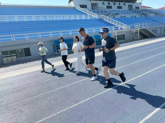 在实操环节中,何老师带领教师们围绕操场进行跑前热身,并现场演示跑姿、摆臂、落地节奏等关键技术动作。针对部分教师在动作中的常见错误,他一一进行纠正与讲解,并鼓励大家关注身体信号、量力而行,构建“安全、有趣、可持续”的运动模式。