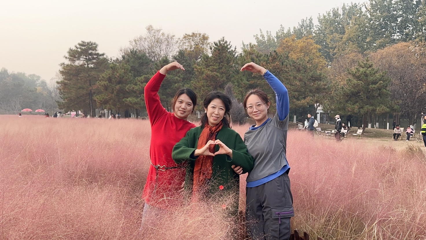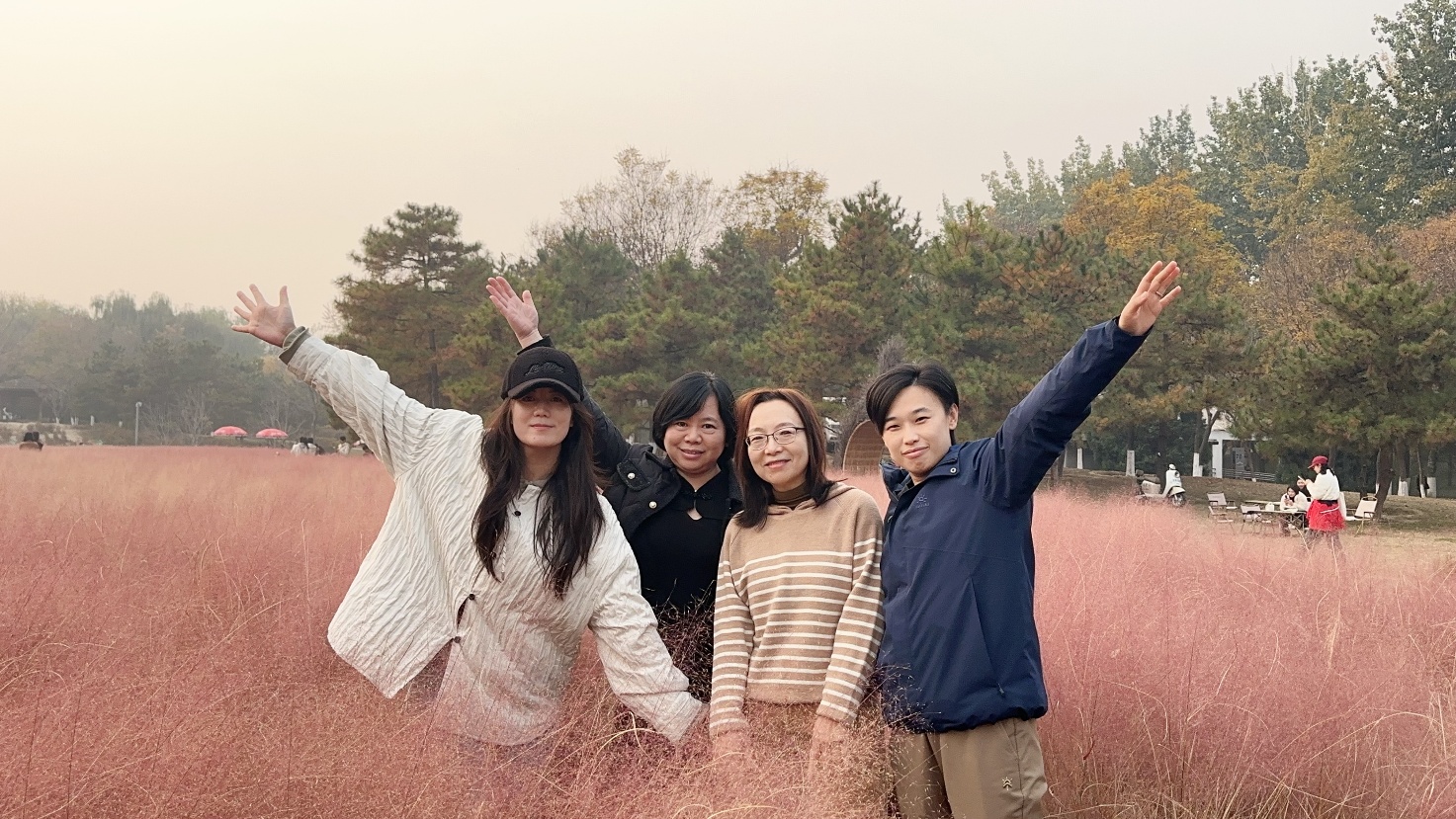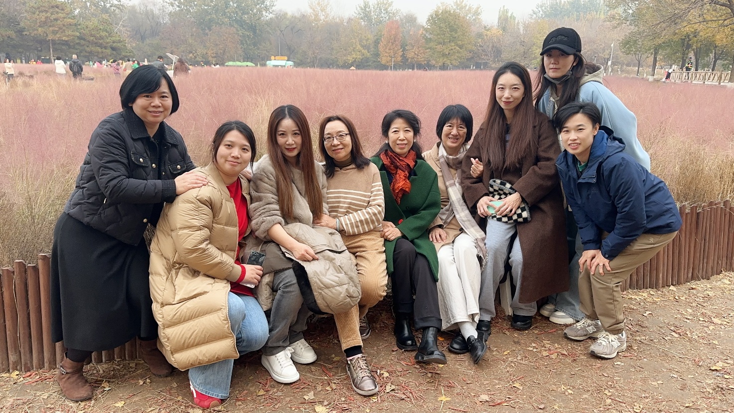 活动集合地点设在北航新东门。虽气温仅十摄氏度出头,但教师们精神饱满、热情洋溢,着装简便而整齐,笑声早已驱散了微凉。到达奥林匹克森林公园后,映入眼帘的便是层林尽染的秋景:一侧银杏林铺满金叶,阳光透过树梢洒下柔光;另一侧粉黛乱子草连成花海,粉色轻盈如雾,如霞似锦,随风摇曳,令人沉醉。老师们纷纷停下脚步,用镜头记录这份难得的秋日浪漫。