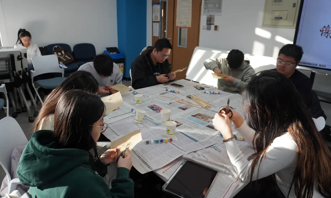 理论讲解结束后,同学们亲身体验了皮影制作。在动手制作前,高志红详细讲解了皮影的制作步骤,并下场帮助同学们完成皮影制作。在高志红的指导下,同学们用剪刀沿着轮廓将雕刻好的半成品皮影剪下,并将每一部分按顺序拼接起来,根据个人喜好为拼好的皮影上色。