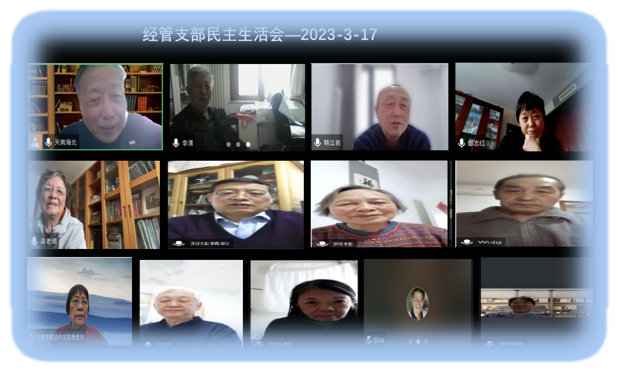 根据我校离退休教职工党委的工作部署和要求,经管退休支部3月17日召开线上年度总结和民主评议会,畅谈学习党的二十大精神体会;总结一年来学习和生活体会,为支部工作提出建议。朱桂芳、邬宽明、李清、张皖生、刘新国、武建国、何玉敏、韩立岩、杨梅英、邹志红老师,和支部高志红、贾素玲、陈向东十三位老师出席了会议,特别是朱桂芳、邬宽明两位八十多岁的老教师,第一次学习使用腾讯会议,非常成功,展现了老年人积极向上的精神。