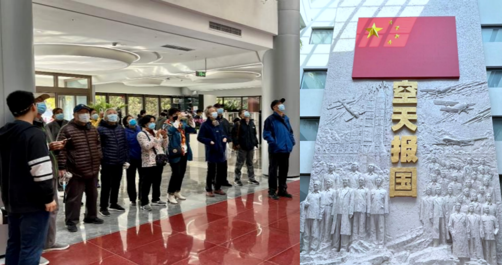 老同志们步入校史馆,首先看到“空天报国”主题雕塑,宏伟的雕塑深深震撼着每个人的心灵,为北航空天报国精神而感动,为我是北航人而骄傲。