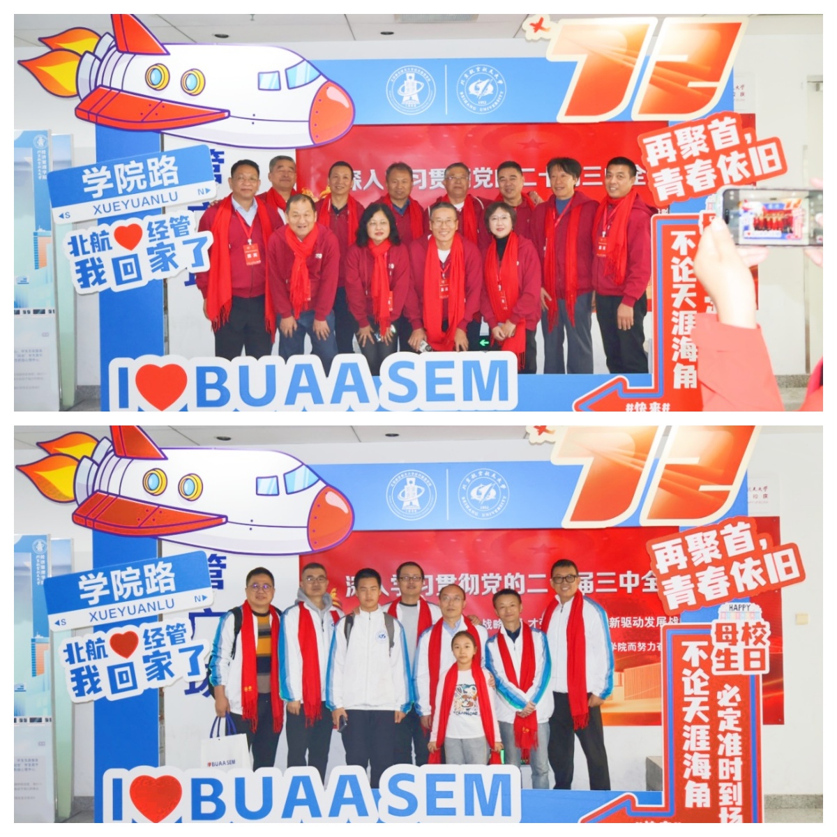 上午9点,校友及家属陆续进入校园,来到新主楼A座六层经管广场,佩戴精致的院徽和喜庆的红围巾拍照打卡,领取学院为校友们精心准备的文创书包、水杯、食堂餐券,抽取特色纪念品。