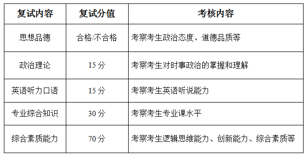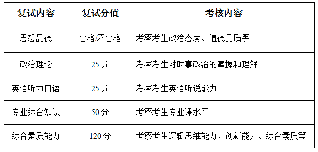 初试满分为500分的考生复试满分220分,初试满分为300分的考生复试满分130分。考生的总成绩=初试成绩+复试成绩,对于符合教育部加分政策的考生,在初试成绩的基础上累计政策加分,同等条件下优先录取。