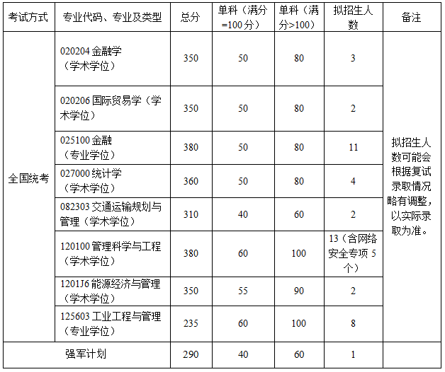 3、我院020206国际贸易学(学术学位)、120202企业管理(学术学位)、120201会计学(学术学位)、1201Z1金融工程(学术学位)接收调剂;020204金融学(学术学位)、082303交通运输规划与管理(学术学位)和1201J6能源经济与管理(学术学位)专业,将根据第一志愿复试录取情况,确定是否接收调剂;其他专业不接收调剂。有关调剂要求将于3月25日左右通过学院网站公布,并同时在教育部调剂系统发布,通过教育部调剂系统进行。