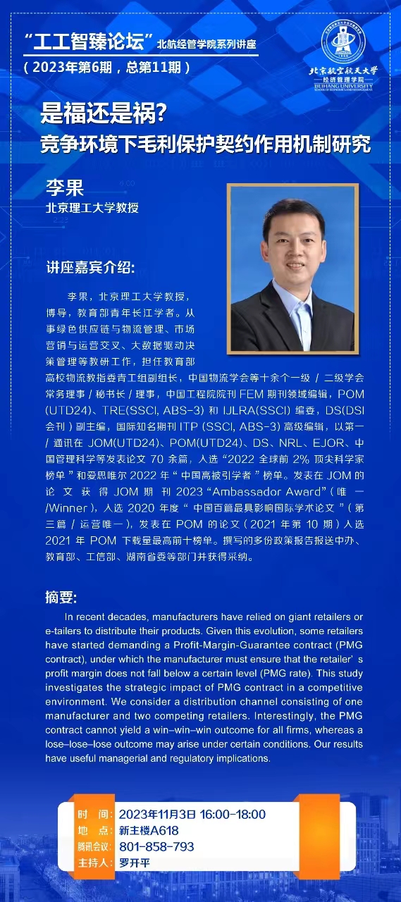 【工工智臻论坛】A Bane or a Boon? Profit-Margin-Guarantee Contract in a Channel with Downstream Competition(是福还是祸? 竞争环境下毛利保护契约作用机制研究)