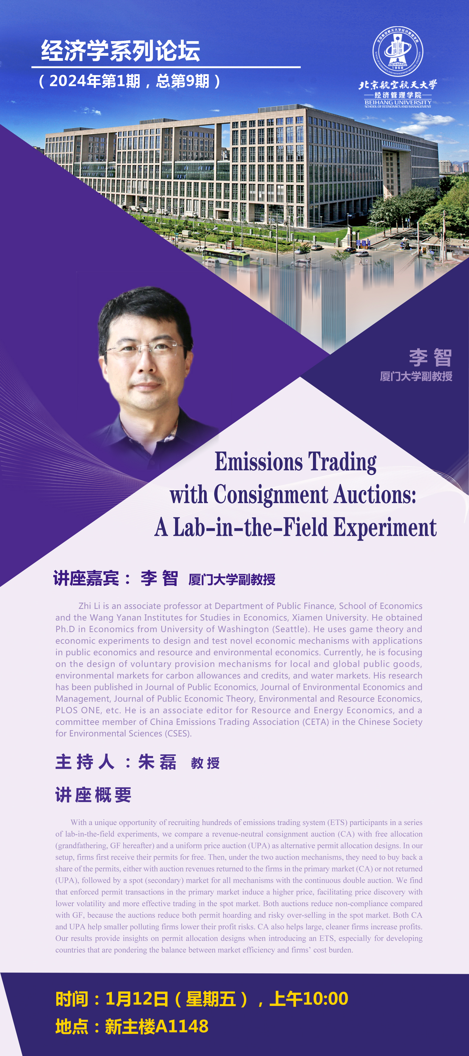 【经济学系列论坛】Emissions Trading with Consignment Auctions: A Lab-in-the-Field Experiment