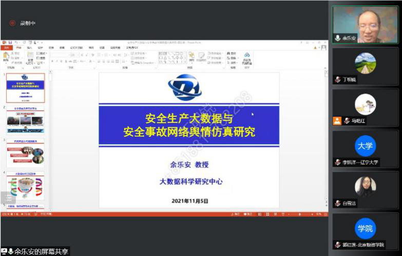 汪寿阳教授以《新冠肺炎疫情预测与新冠肺炎疫情影响评估》为题,紧密结合国内疫情防控现状,详细阐释了疫情防控期间其科研团队的最新成果,例如各类新冠肺炎确诊人数预测模型、预测结果和隔离效果评价等,并从应急管理角度对疫情防控政策提出具体建议;余乐安教授以《安全生产大数据及安全事故网络舆情仿真分析》为题,围绕安全生产大数据采集、安全生产大数据平台的服务和应用,安全事故网络舆情仿真分析三方面介绍了在安全生产和事故预防领域的研究成果,并结合近期舆情实例进行了具体阐释;杨立兴教授做了《面向韧性提升的城市轨道交通应急管理优化模型及算法》的报告,围绕如何提升城市轨道交通的系统韧性进行了深入分享及策略探讨,提出应面向“事前-事中-事后”多个运行阶段全系统采取管控手段,并阐述了面向系统安全的城市轨道交通客流管控等三类应急管理优化方法。