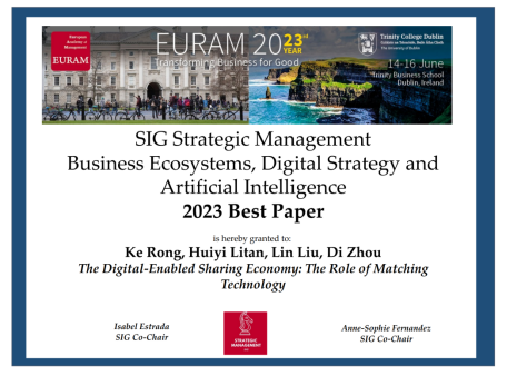 beats365亚洲版官网经管学院刘霖教授在第23届欧洲管理学年会(EURAM)上荣获2023最佳论文奖(Track: Business Ecosystems, Digital Strategy and Artificial Intelligence)。获奖文章为“The Digital-Enabled Sharing Economy: The Role of Matching Technology”,与戎珂教授(清华大学社科学院),博士生李谭卉一(清华大学社科学院),周迪博士(同济大学经管学院副研究员)合著,刘霖教授为通讯作者。