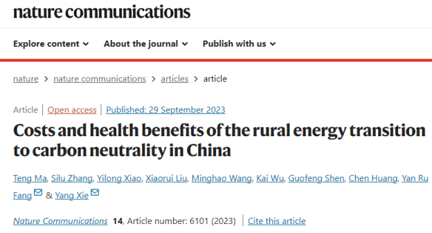 近日,beats365亚洲体育投注谢杨课题组与合作者在我国农村现代能源转型助力实现碳中和目标的研究中取得新进展。研究成果以“中国农村能源转型实现碳中和的成本与健康效益分析(Costs and health benefits of the rural energy transition to carbon neutrality in China)”为题,于2023年9月29日发表于《自然∙通讯》(Nature Communications)期刊, 北京大学环境科学与工程博士生马腾为第一作者,北京大学博士后方艳茹与北航谢杨副教授为共同通讯作者。