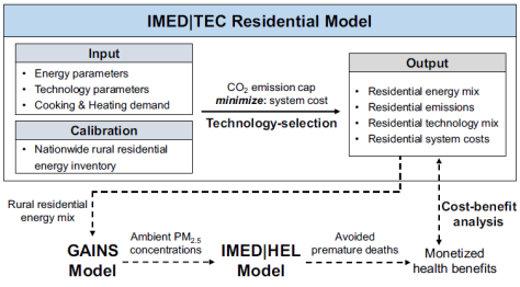 农村居民能源向现代能源转型对于中国实现“碳中和”目标、空气质量改善目标至关重要,有助于协同实现获取清洁能源、良好的健康与福祉等可持续发展目标,较少有研究在省级层面关注农村居民能源系统实现碳中和目标的转型路径,农村能源转型的技术成本与健康效益尚不清晰。研究基于谢杨课题组与北京大学合作研发的IMED综合评估模型,构建了“居民能源-空气质量-公众健康”模型框架(见图1),通过对农村居民能源系统实现碳中和目标的转型路径分析,发现中国农村现代能源转型可助力实现碳中和目标与公众健康改善。