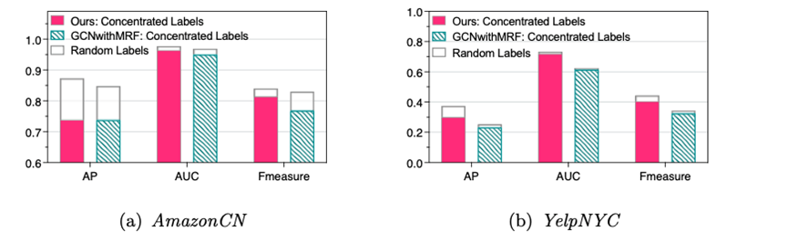 图4 标记数据在网络中的分布对检测结果有显著的影响,而我们提出的方法整体的鲁棒性较强