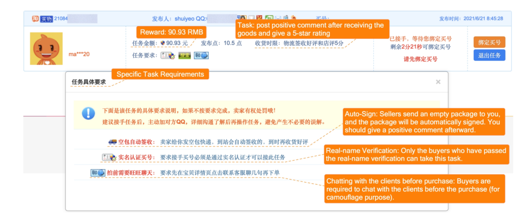 在线评论已经成为了亚马逊、淘宝、Yelp 等电商平台的显著特点,用户能够发表评分和评论,从而帮助潜在消费者直接了解产品和商家的更多信息。实际上,产品和商家的销量在很大程度上受到在线评论的影响,而有偏见的评分可能会反过来扭曲消费者对产品的认知。基于此,一些商家发现了可以通过操纵评分来获得利益的机会。例如,通过故意发布虚假评论来提高自己的评分或降低竞争对手的评分。由于从虚假评论中能够获得非法利益,有些虚假评论服务提供商可能会通过众包的方式雇佣真实的平台用户为目标商家或产品撰写虚假评论。我们在图1中展示了一个虚假评论服务提供商的屏幕截图,任务要求用户使用经过验证的真实姓名下订单,并在发送空包裹后,让用户发布5星级评分,最后用户在任务完成时可以获得一定数量的报酬。类似地,亚马逊也已经发现某些供应商出售和购买虚假评论的不当行为在平台上广泛存在。