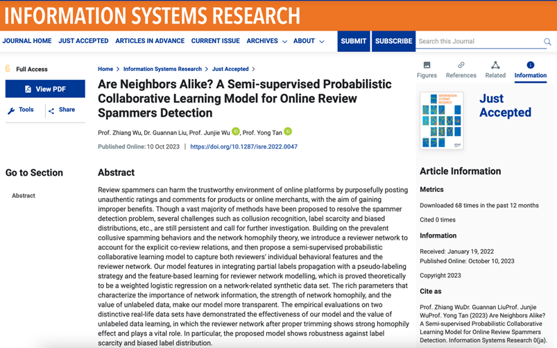 在2023年10月在线发表于《INFORMATION SYSTEMS RESEARCH》上的论文《Are Neighbors Alike? A Semi-supervised Probabilistic Collaborative Learning Model for Online Review Spammers Detection》(DOI: 10.1287/isre.2022.0047)中,实验室学者刘冠男副教授、吴俊杰教授以及南京审计大学伍之昂教授、华盛顿大学谭勇教授,针对虚假评论者检测问题,提出了一个半监督概率协同学习模型,文章的主要观点如下。